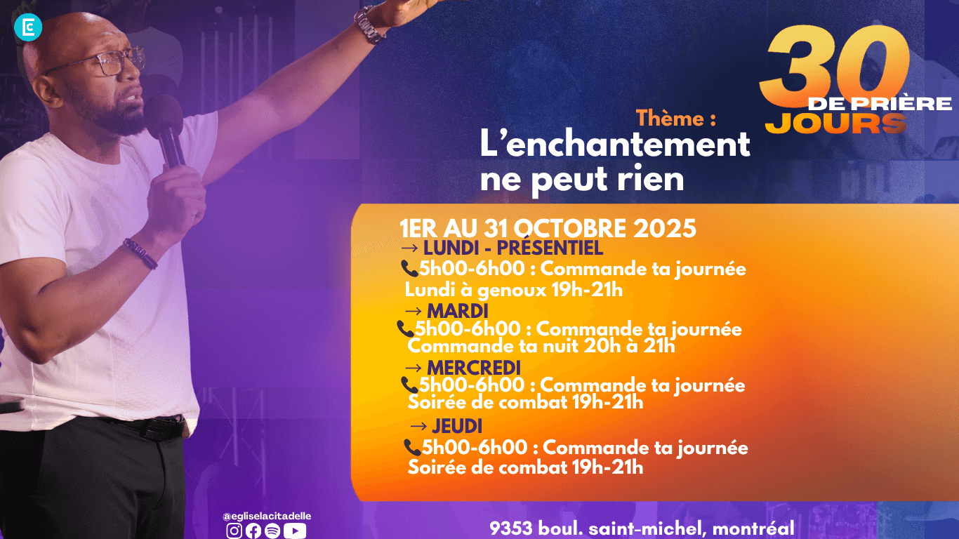 Thème: L'enchantement ne peut rien Tiré de Nombres 23:23 HORAIRES DU TEMPS DE PRIÈRE Lundi 05h00-06h00: Commande ta journée (Ligne téléphonique) 19h00-21h00: Lundi à genoux (Présentiel et Ligne téléphonique) Mardi 05h00-06h00: Commande ta journee (Ligne téléphonique) 20h00-21h00: Commande ta nuit (Ligne téléphonique) Mercredi 05h00-06h00: Commande ta journée (Ligne téléphonique) 19h00-21h00: Soiréé de combat (Présentiel) Jeudi…